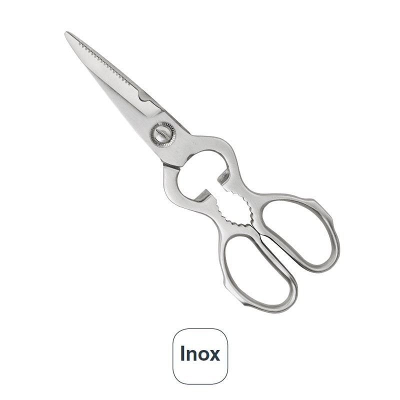 Tesoura em aço inox com 50-54 HRc do grau de dureza do metal, válidas também como abridor de garrafa e quebra-nozes. Medidas: 7x20 cm