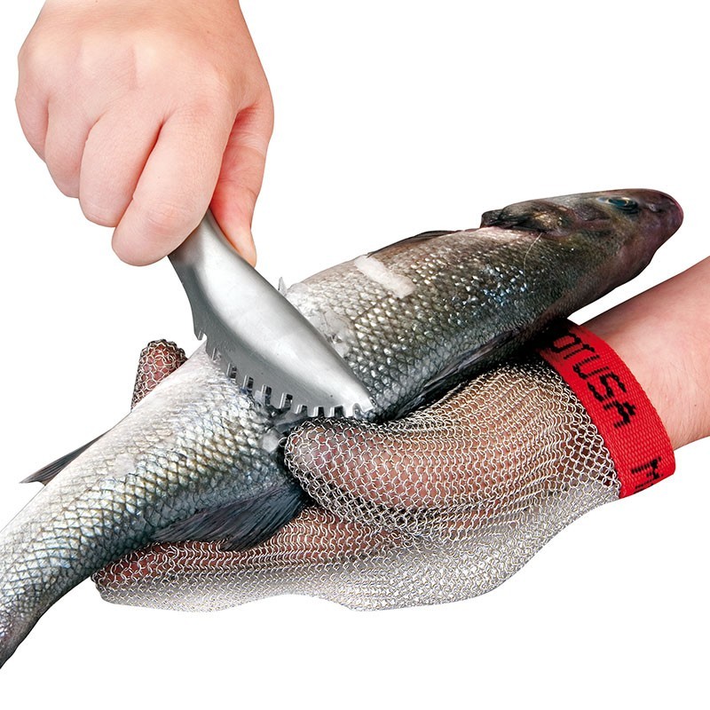 Luva anticorte de cota de malha de aço inoxidável com alça de apoio para o pulso. Disponível em vários tamanhos.