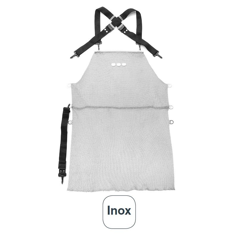 Avental profissional de cota de malha anticorte de aço inox com alças ajustáveis de fixação verticais e horizontais.