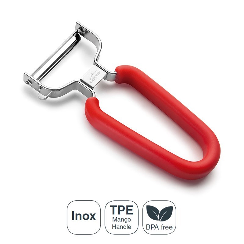 Descascador de batatas em "E" de 12,5 cm de comprimento, fabricado em aço inoxidável de alta qualidade com punho em termoplástico vermelho.