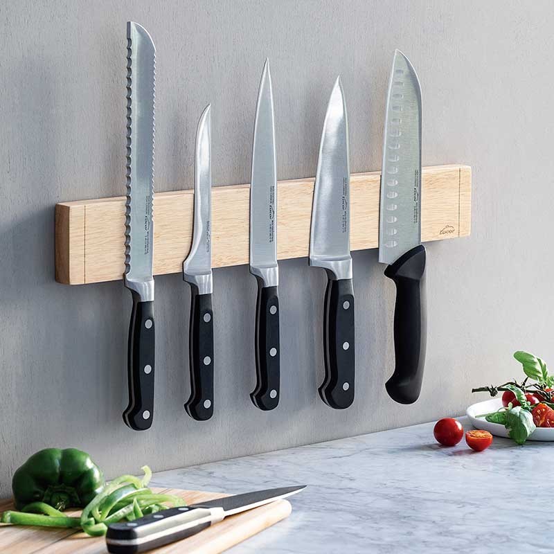Elegante suporte magnético para facas de cozinha fabricado em madeira de borracha. Inclui todo o necessário para sua montagem.