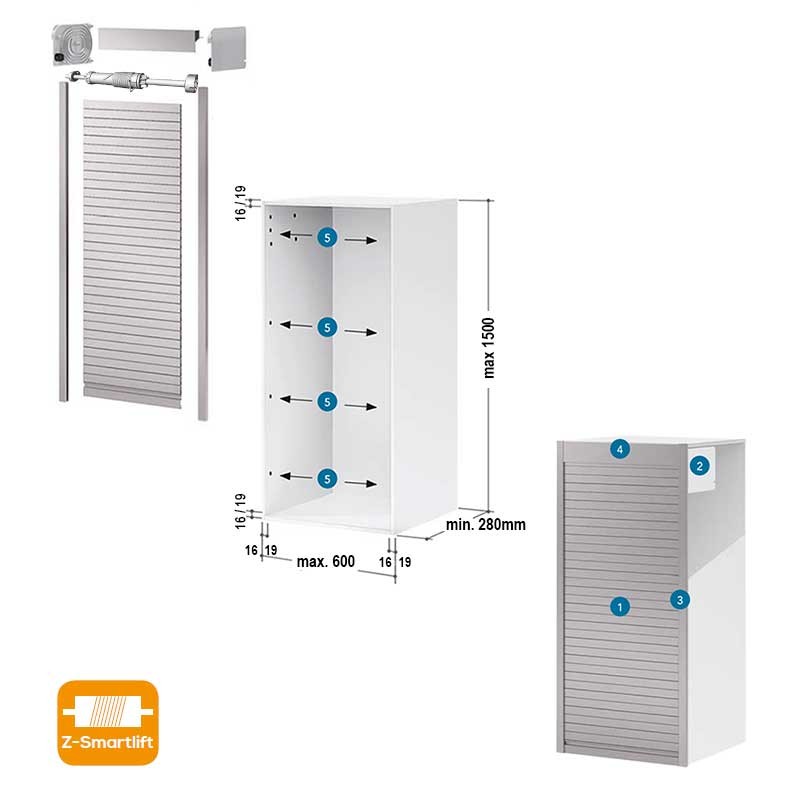 A montagem do kit é simples e rápida de instalar na frente do móvel, pois não necessita de nenhuma usinagem especial além dos furos para ancorar o mecanismo de enrolamento e os perfis laterais. Além disso, em caso de necessidade de adaptar a persiana a uma medida específica, será fácil de realizar mediante o corte das ripas e da cornija para ajustar a largura, ou os dois perfis laterais no suposto de ajustar também a altura. Também será necessário cortar o eixo do mecanismo Z-Smartlift por uma das suas extremidades seguindo as instruções para adaptar a persiana à largura, se necessário.