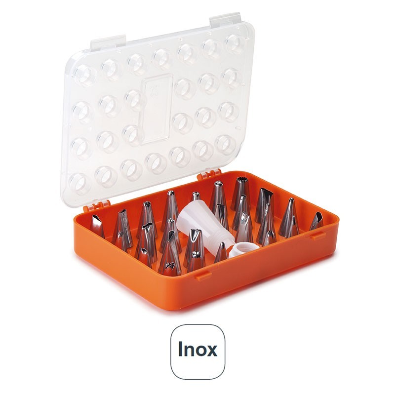 Estojo com 26 bicos de confeitaria variadas para decorar com saco de confeitar, fabricadas em aço inoxidável de grande qualidade.