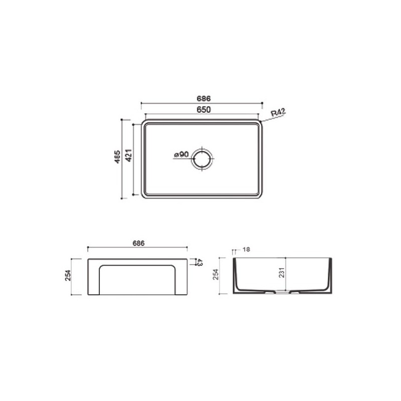 Pia branco de cerâmica modelo Lagoon 27 686 x 485 mm para instalação sobre bancada ou sob a bancada.
