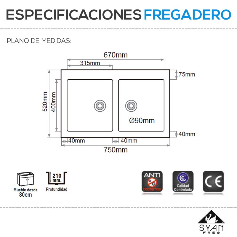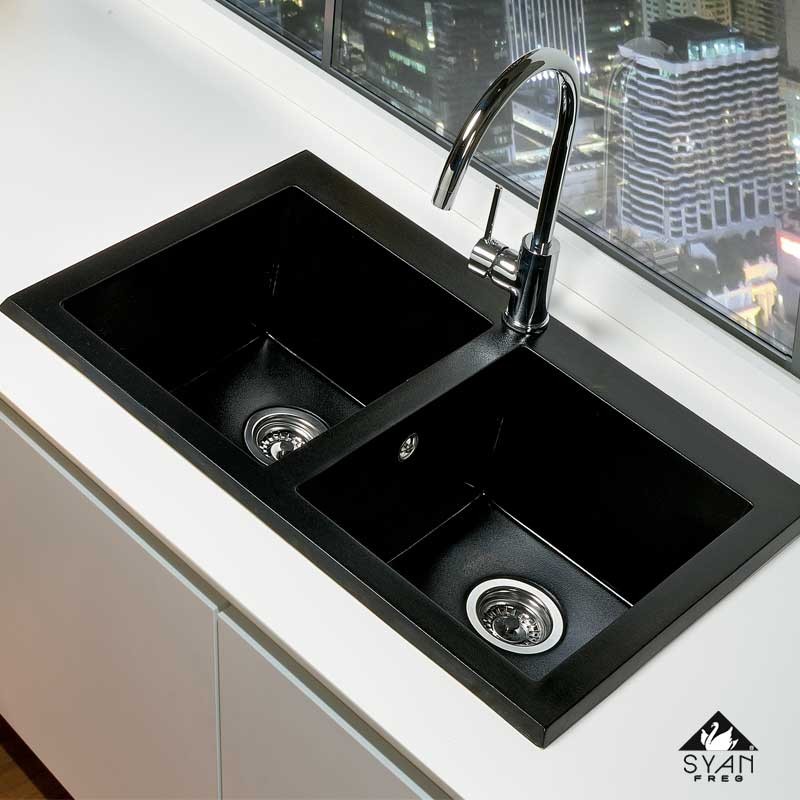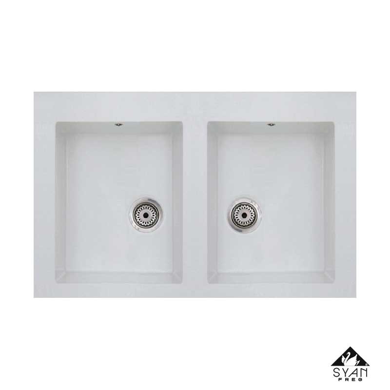 Pia em bancada en resina sintética MODELO GEA com 2 bacias quadradas