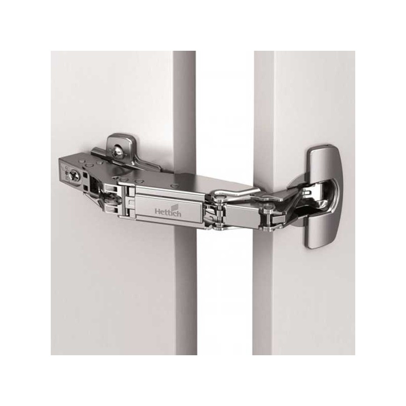 Dobradiça grande angular para móveis de cozinha canto em L Hettich Sensys com amortecimento, ângulo de abertura de 165 ° e montagem rápida por grampo na base da dobradiça.
