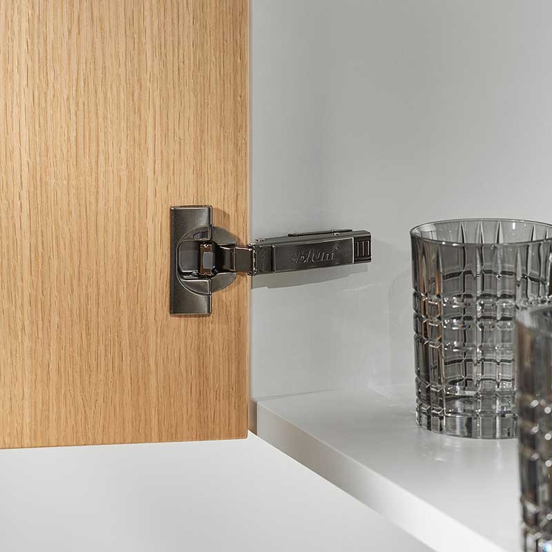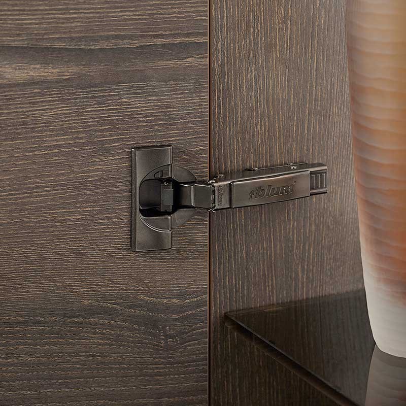 A linha de dobradiças CLIP top e CLIP top BLUMOTION Blum com acabamento preto ônix combina facilmente com móveis escuros, proporcionando um toque sutil de elegância.
