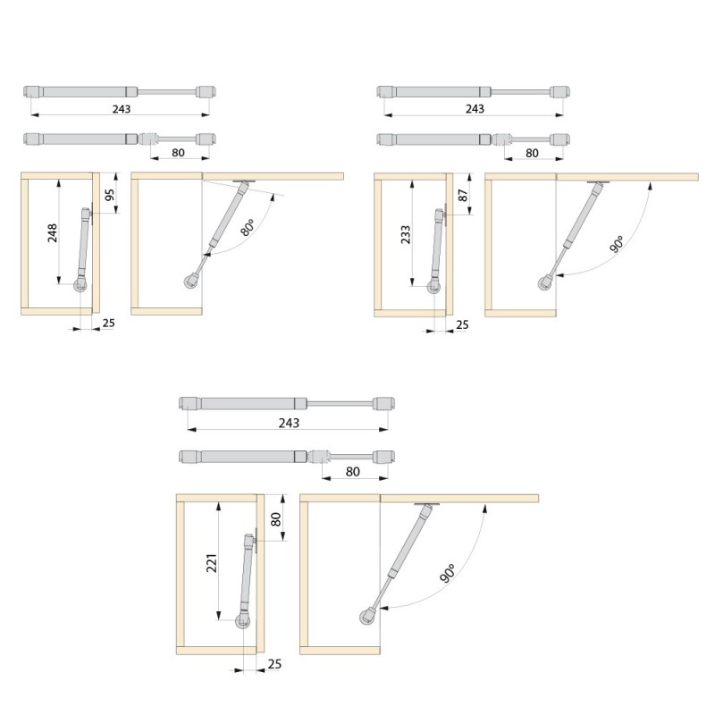 Pistões para móveis que permitem a abertura das portas de madeira ou com moldura de alumínio. Proporcionam uma elevação amortecida da porta elevável em móveis de cozinha, casa e banheiro. Esses pistões amortecedores são fornecidos embalados individualmente com as instruções de montagem. Cada bolsa contém um pistão, um encaixe para lateral, um encaixe para porta de madeira, um encaixe para porta com moldura de alumínio e os parafusos necessários.
