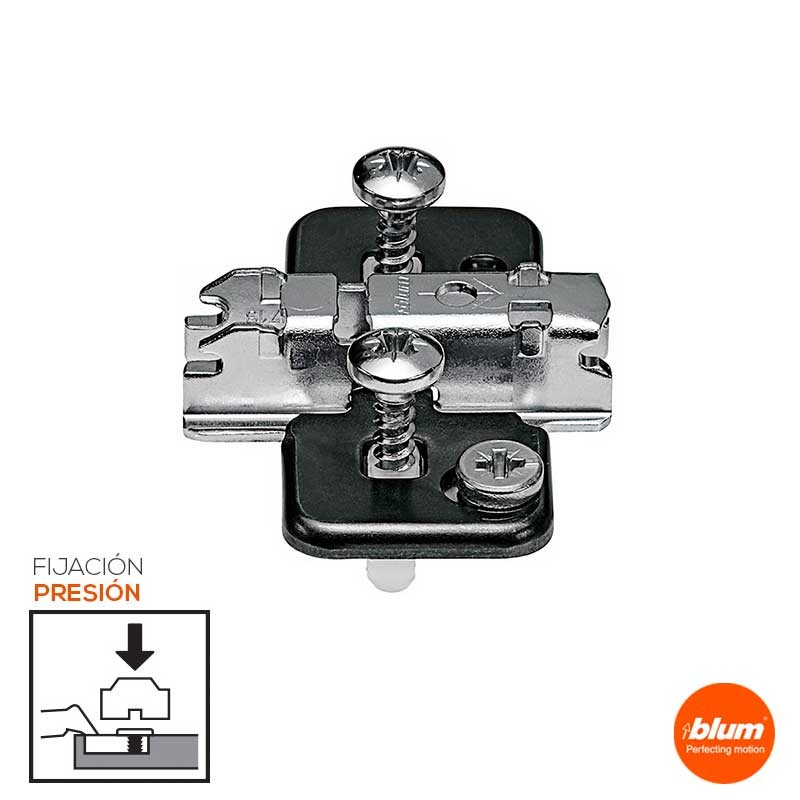 Calço em cruz para dobradiças Blum na cor preto ônix com excêntrica de ajuste e montagem de pressão com buchas de 5 mm.