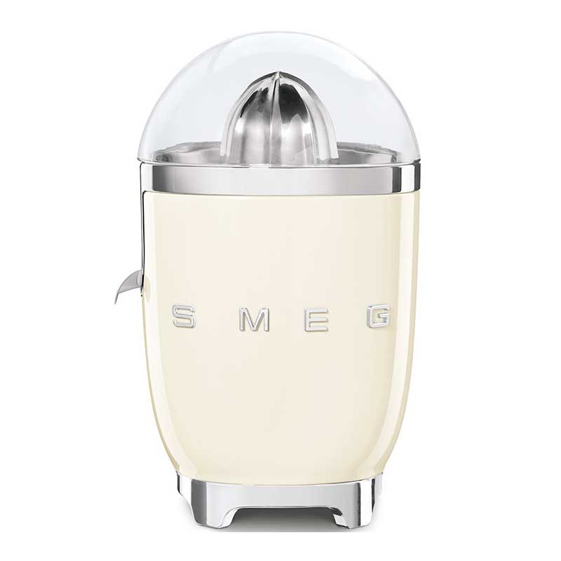 Espremedor de suco manual Smeg 50's Style de 70W com corpo de alumínio fundido acabamento creme brilho e cone de aço inoxidável.