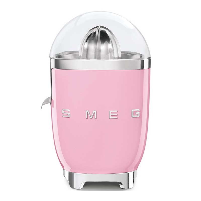 Espremedor de suco manual Smeg 50's Style de 70W com corpo de alumínio fundido acabamento rosa brilho e cone de aço inoxidável.