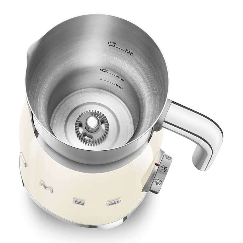Espuma de leite Smeg 50's Style com corpo em aço inoxidável acabamento creme brilho e 6 programas para preparar bebidas quentes ou frias com ou sem espuma.