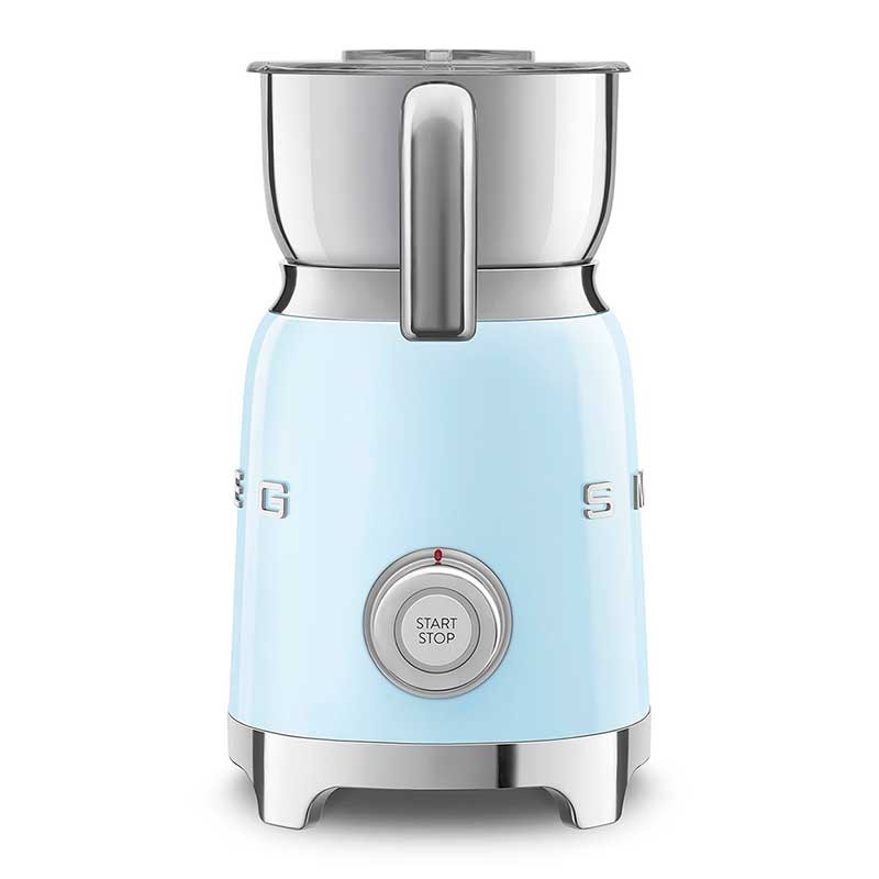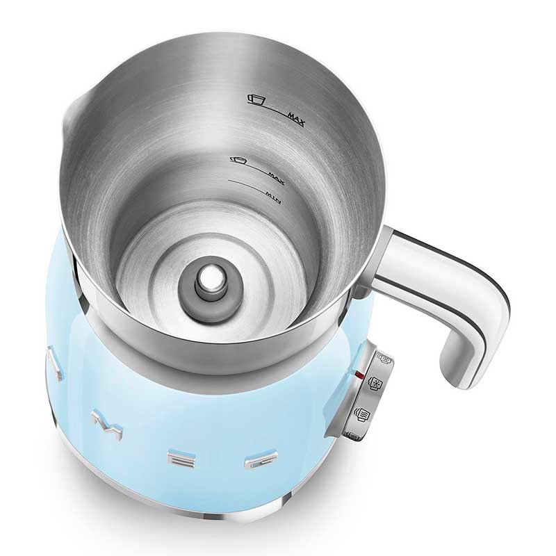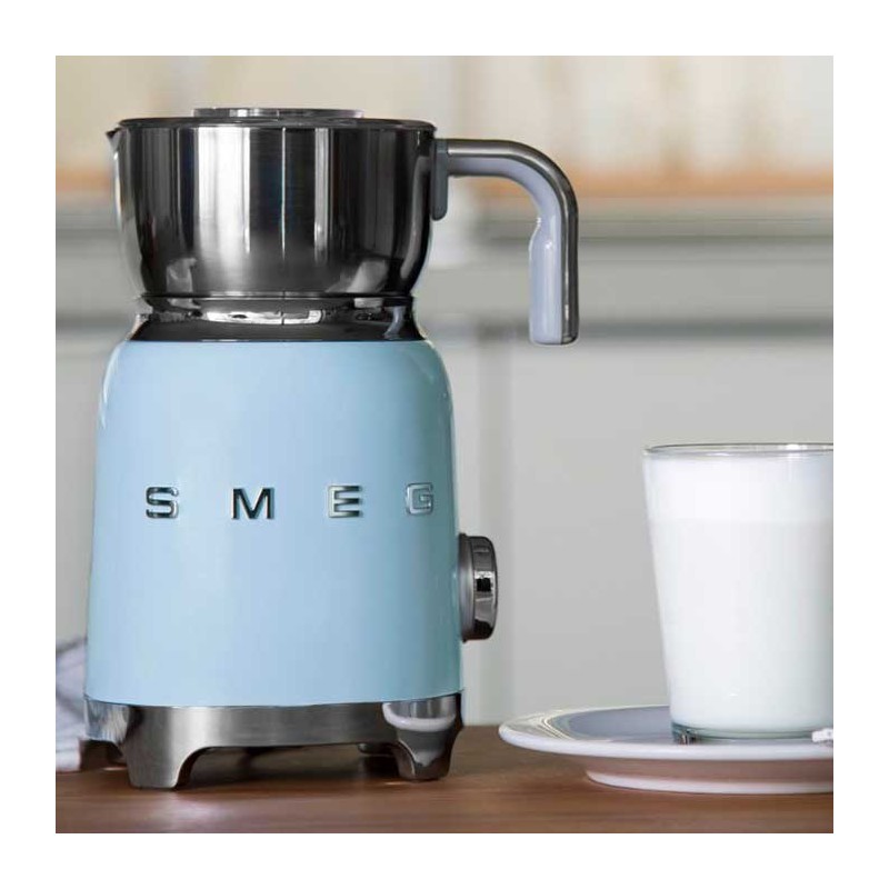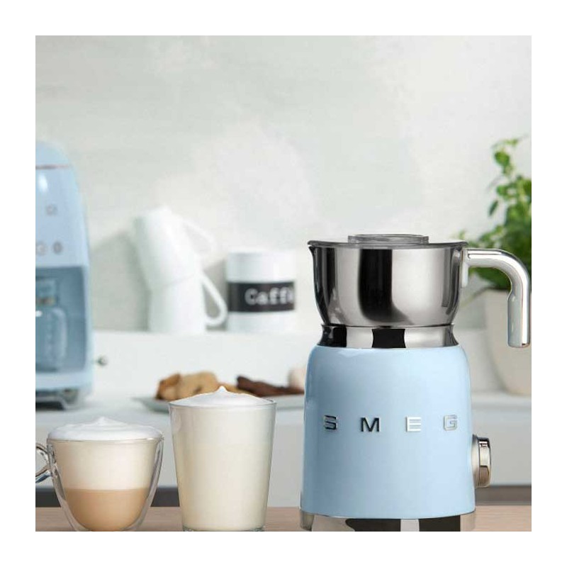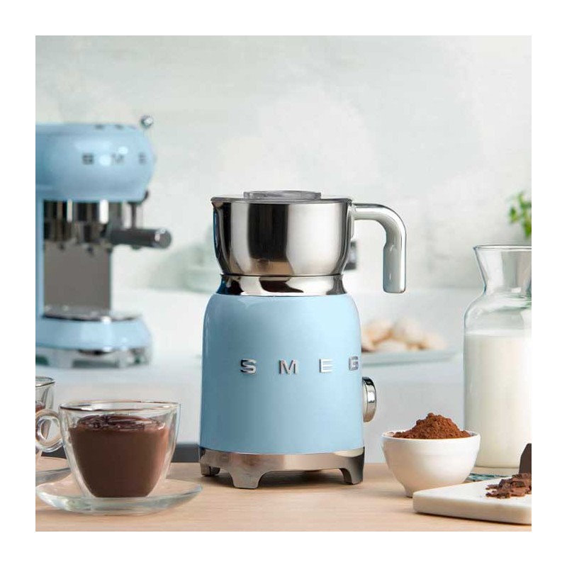 Espuma de leite Smeg 50's Style com corpo em aço inoxidável acabamento azul céu brilho e 6 programas para preparar bebidas quentes ou frias com ou sem espuma.