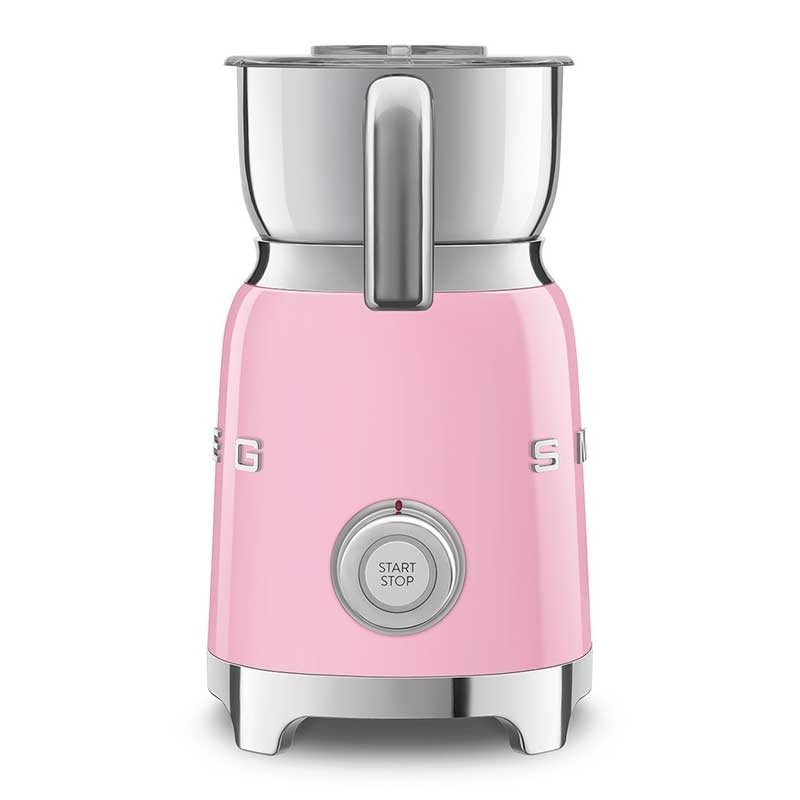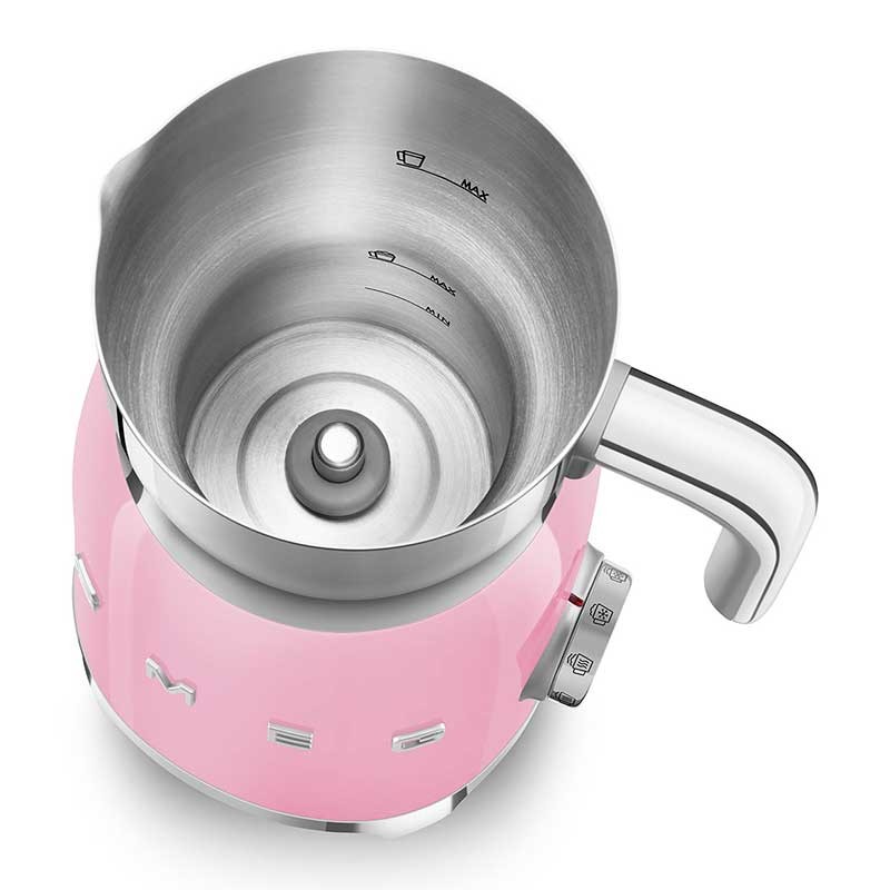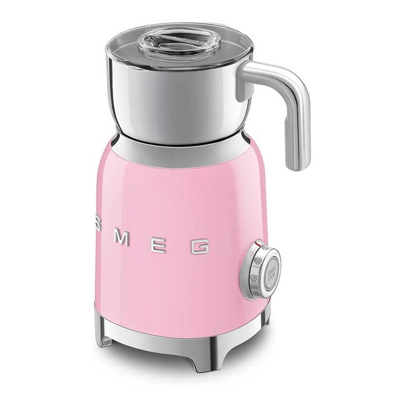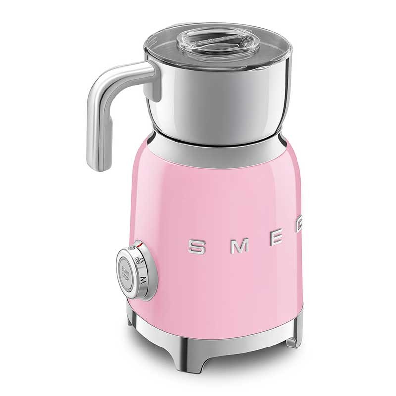 Espuma de leite Smeg 50's Style com corpo em aço inoxidável acabamento rosa brilho e 6 programas para preparar bebidas quentes ou frias com ou sem espuma.