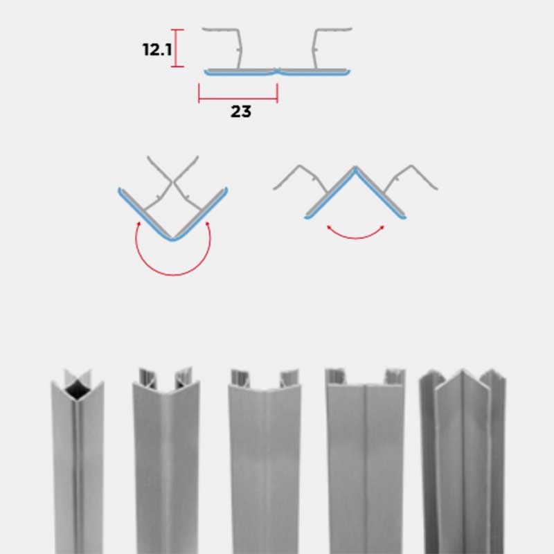 Ângulo flexível variável de 10 ou 15 cm de altura para rodapé de PVC fabricado neste mesmo material com lâmina de alumínio acabamento ouro.