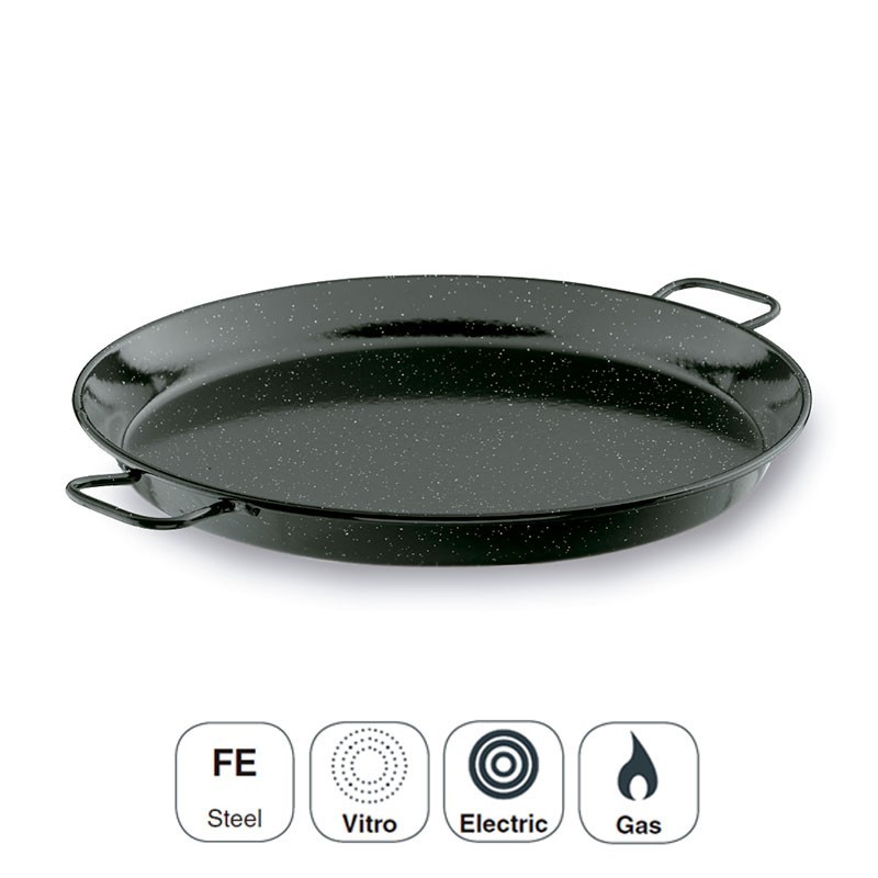 Paellera esmaltada fabricada em aço de grande resistência e qualidade. Apta para fogões a gás, placas e elétricas.