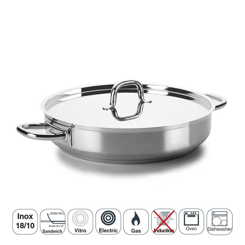 Paellera profissional sem tampa modelo Chef Luxe fabricada em aço inoxidável 18/10 com fundo termodifusor sanduíche adequado para placas de indução, elétricos, placas e fogões a gás.