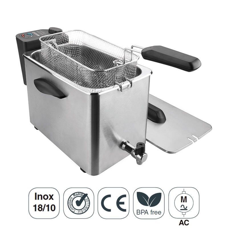 Fritadeira elétrica semi-profissional de 2500 W, 4 litros de capacidade e torneira interno para tirar o óleo, fabricada em aço inoxidável 18/10 de alta qualidade.