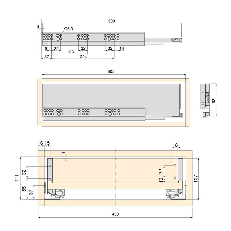 Kit para gaveta da cozinha ou casa de banho de 93 mm de altura em aço cinza antracite com guias de 50 cm de profundidade. Inclui base e traseira de melamina.