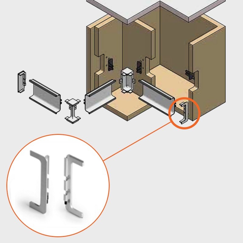 Para o espaço superior onde terminam os móveis ou como acabamento lateral, será necessário o perfil superior em acabamento branco.