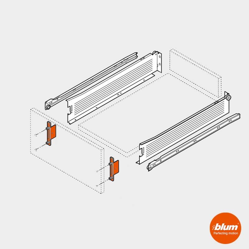 Fixações frontais com parafusos para gavetas Blum Metabox. Compatível com todos os modelos exceto Metabox altura N 54 mm. Conteúdo: 2 pçs.
