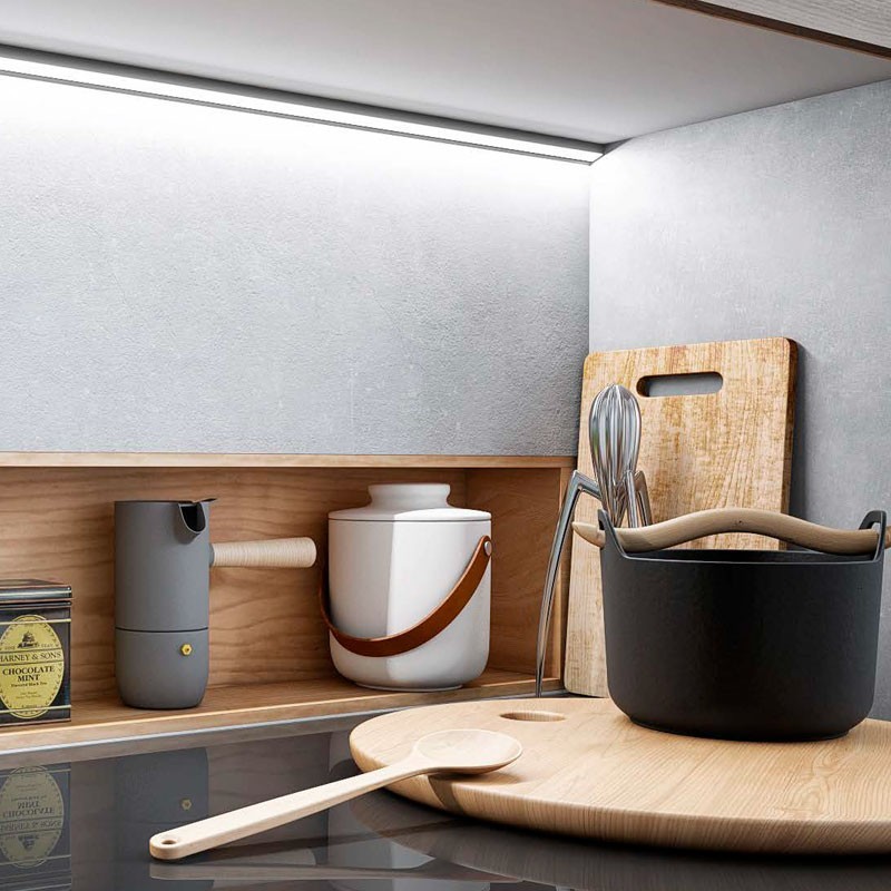 A régua Mycorner Black possui as mesmas características que a régua Geo Corner, porém com um acabamento em preto que a torna muito mais elegante e moderna. Construída sobre perfil de alumínio, sua potência de 11,5W/m é suficiente para iluminar uma bancada de cozinha. Mas se busca maior potência e rendimento, apresentamos esta variante que não deixará ninguém indiferente. Possibilidade de solicitar as réguas com o mesmo interruptor de led azul, mas que em vez de On/Off seja também regulador de intensidade.