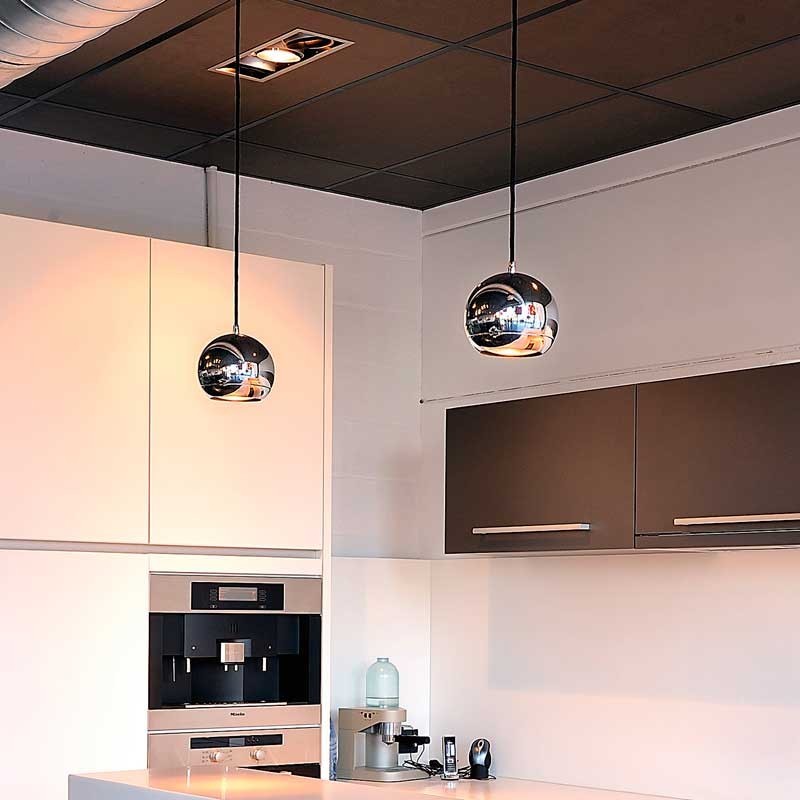 Candeeira suspensa modelo Eye Light em aço com acabamento cromado.