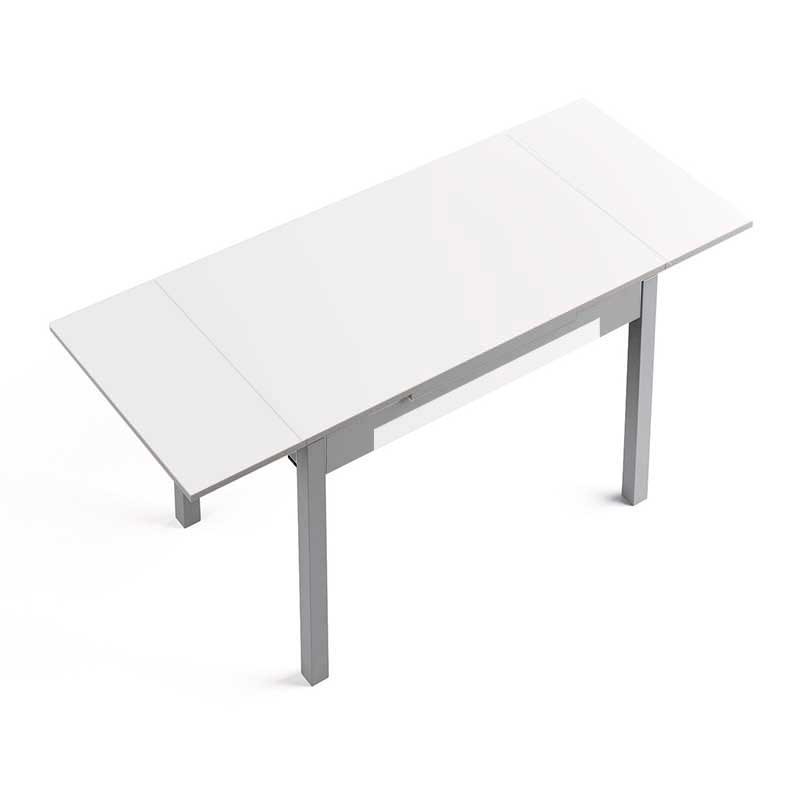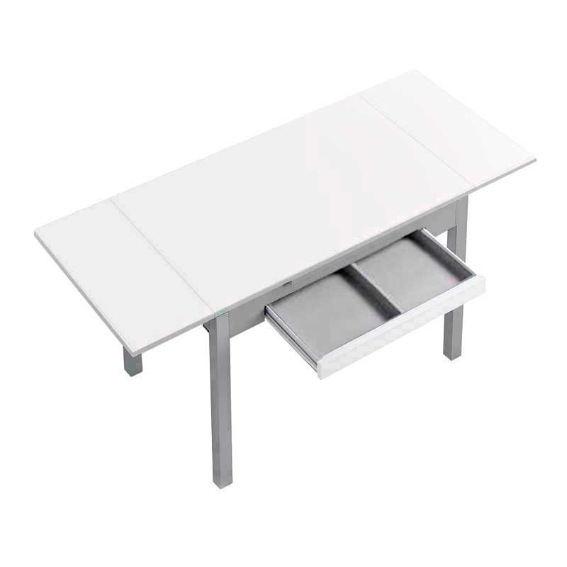 Conjunto de mobiliário de cozinha composto por uma mesa extensível fabricada com bancada de laminado branco de 19 mm de espessura com cantos de PVC branco e 2 Extensões com guias automáticas (uma em cada extremidade) de 30 cm cada, gaveta com guias metálicas de extração total e pernas de aço quadradas de 50x50 mm em cor epóxi alumínio.