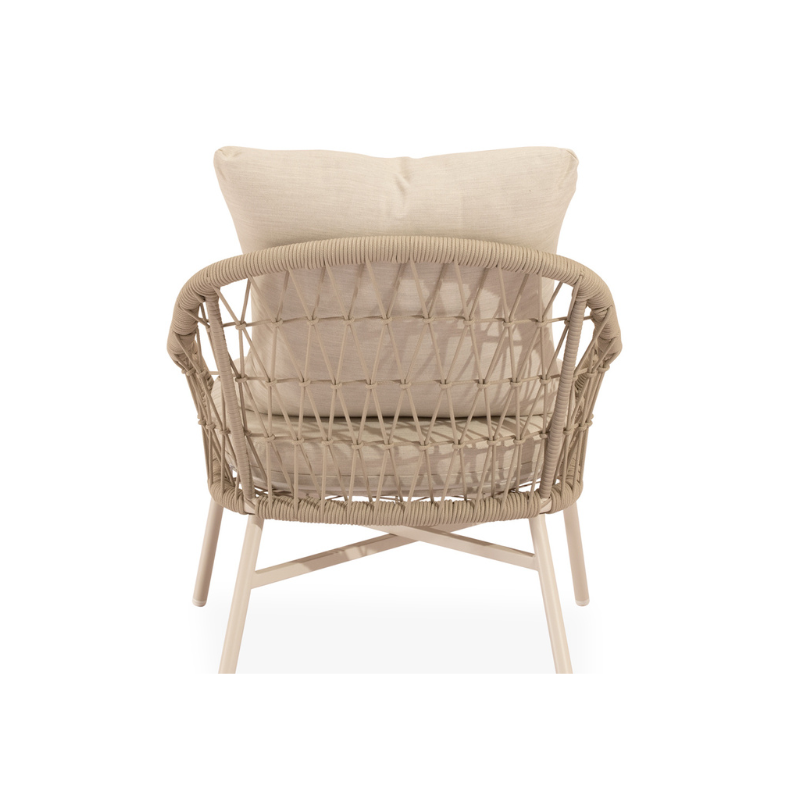 Composto por duas poltronas, um sofá duplo e uma mesa de centro com tampo de vidro temperado de 5 mm de espessura, este conjunto oferece uma estética delicada e acolhedora. Sua estrutura de aço galvanizado combina perfeitamente com a corda trançada à mão, criando um design fluido e contemporâneo.