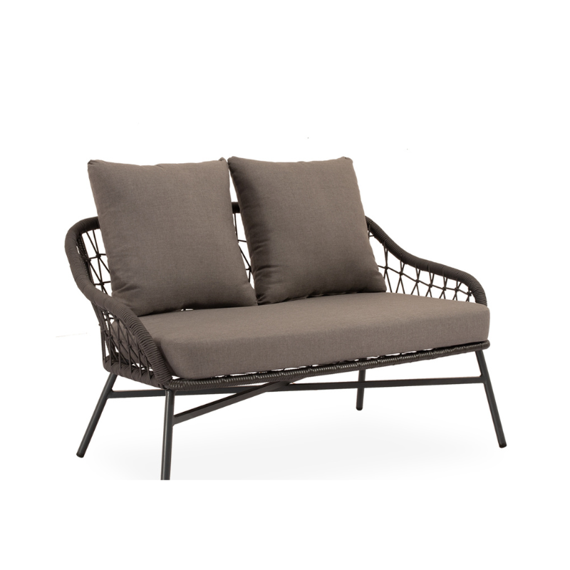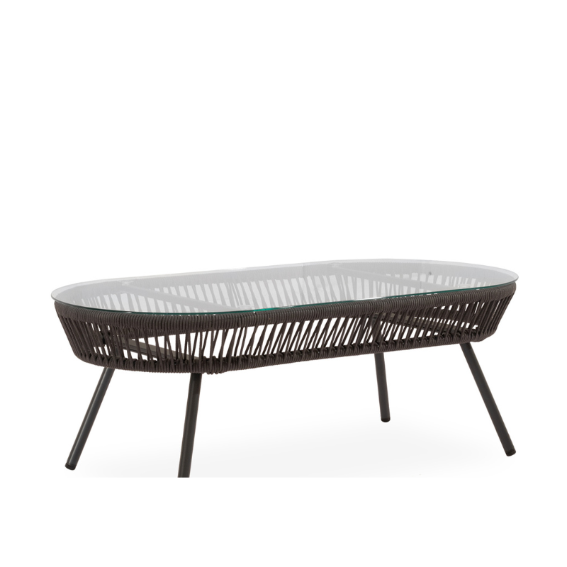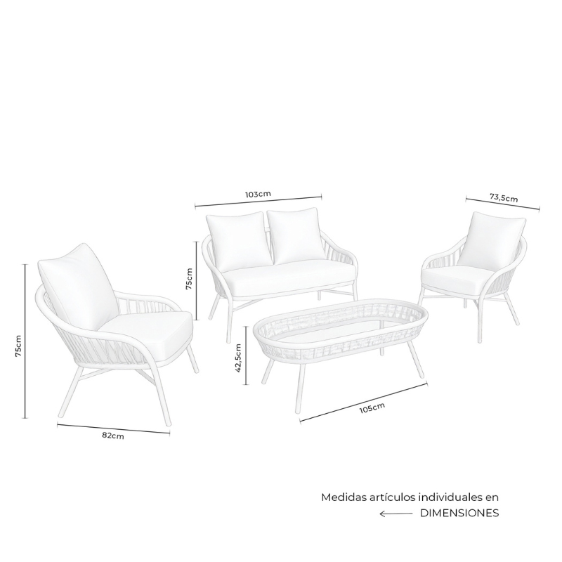 Composto por duas poltronas, um sofá duplo e uma mesa de centro com tampo de vidro temperado de 5 mm de espessura, este conjunto oferece uma estética delicada e acolhedora. Sua estrutura de aço galvanizado combina perfeitamente com a corda trançada à mão, criando um design fluido e contemporâneo.