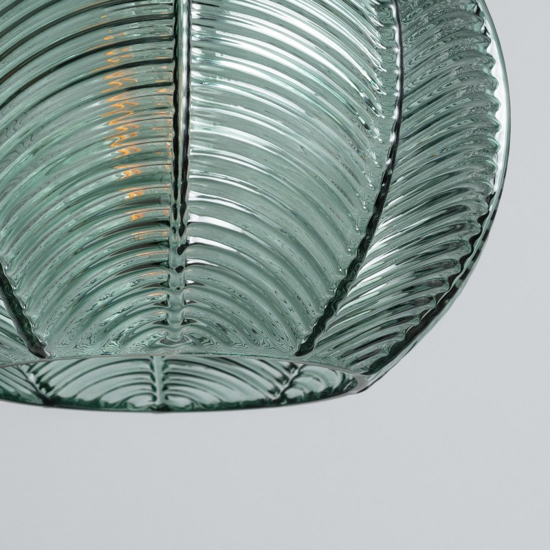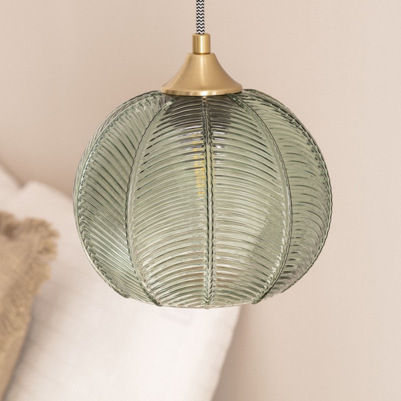 A lâmpada pendente cristal Klimt é feita de metal e vidro. Seu abajur esférico, com relevos sutis e um toque azulado, evoca as lâmpadas clássicas dos anos 20, destacando-se como sua principal característica de design.