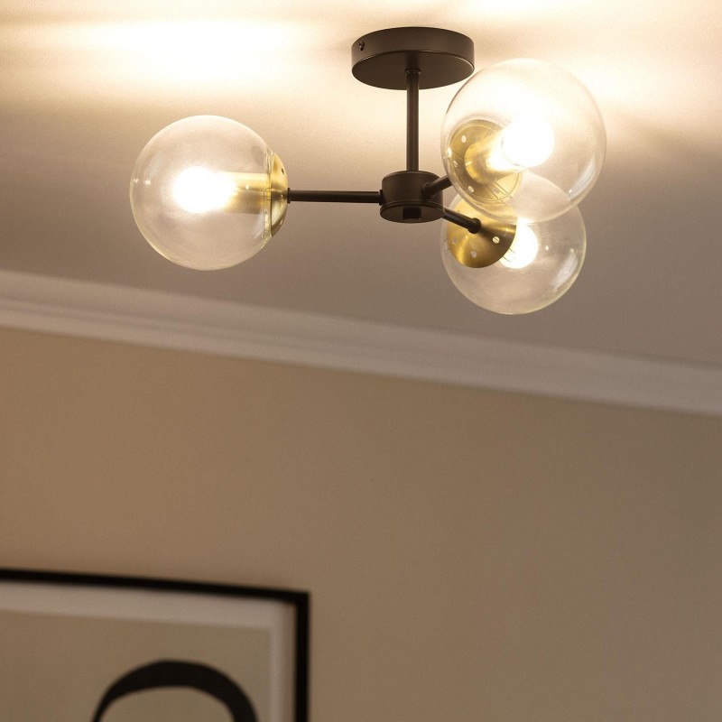 Esta lâmpada apresenta um corpo principal rígido ligado ao Florão, fabricado em metal com acabamento preto e detalhes dourados, juntamente com três tulipas esféricas de vidro transparente que maximizam a difusão da luz.