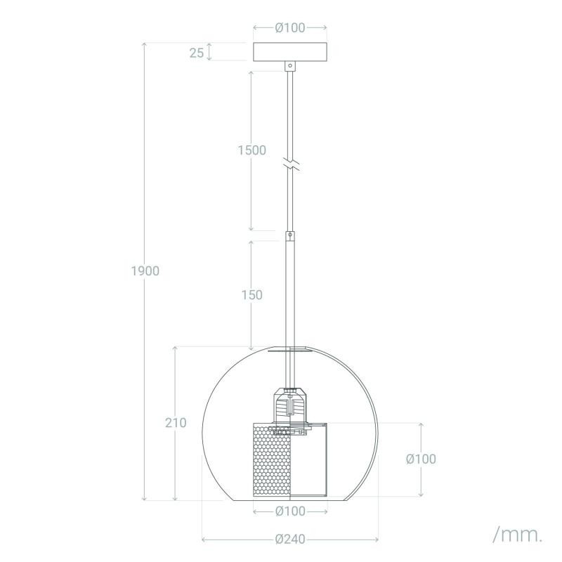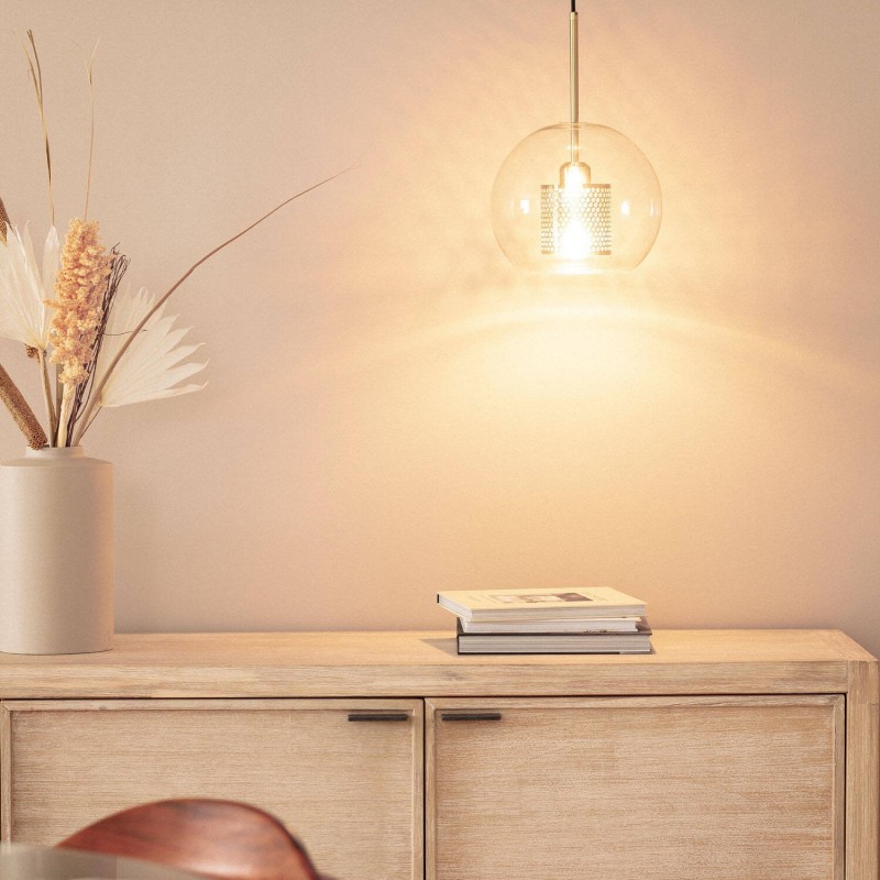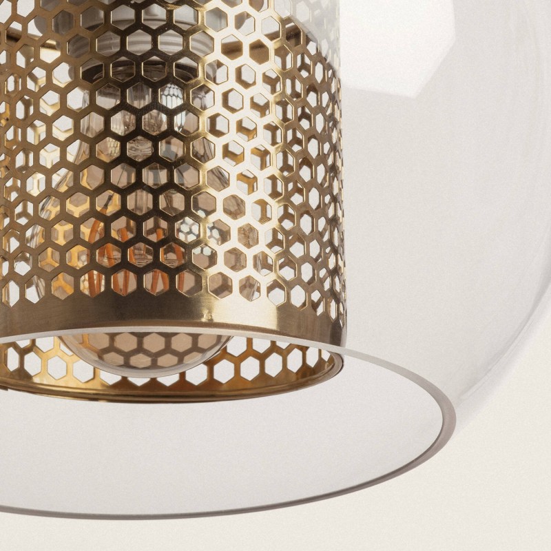 Esta lâmpada possui um suporte de lâmpada de design feito de metal com acabamento em ouro acetinado. A estrutura do suporte da lâmpada apresenta um cilindro que evoca a forma de um painel de abelhas, proporcionando não apenas proteção para o soquete e a lâmpada, mas também um efeito de luz muito original. Tudo isso é envolto em uma tulipa esférica de vidro com acabamento transparente.