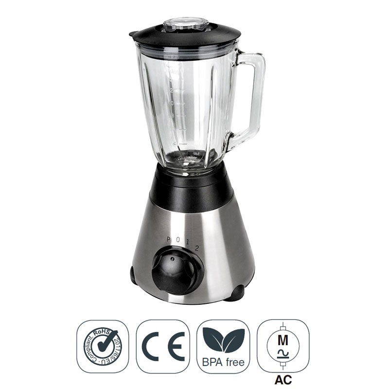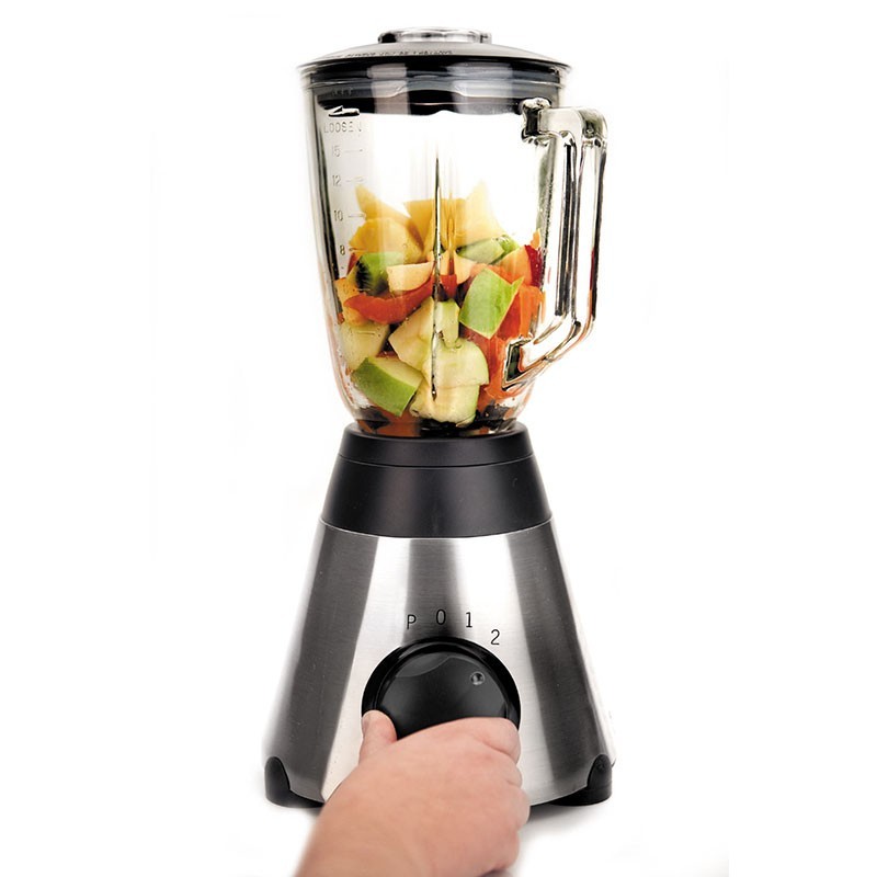 Batedor de cozinha de 500 W de potência, 2 velocidades mais função para picar gelo, jarro de vidro de 1,5 l de capacidade e corpo de aço inoxidável.
