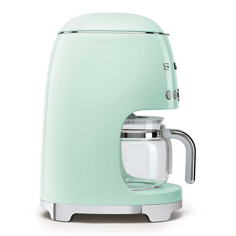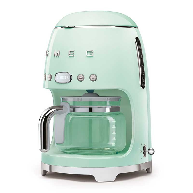 Cafeteira de gotejamento-filtro Smeg 50's Style com seleção de intensidade de café regulável e corpo de aço inoxidável e ABS acabamento Verde Água Brilho.
