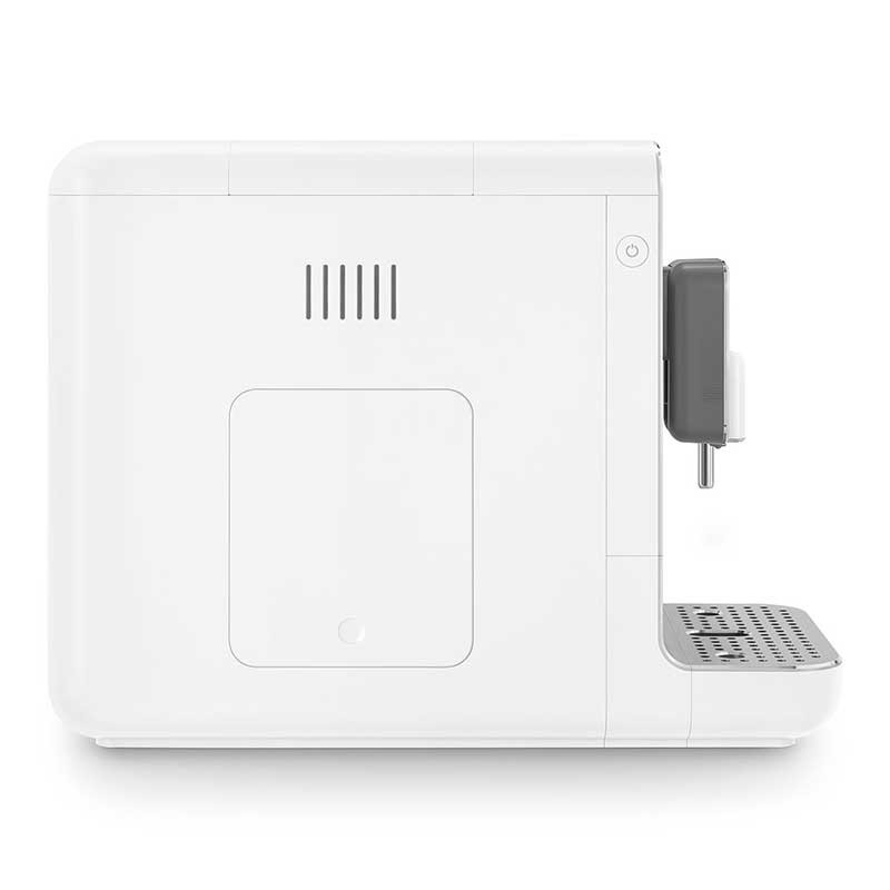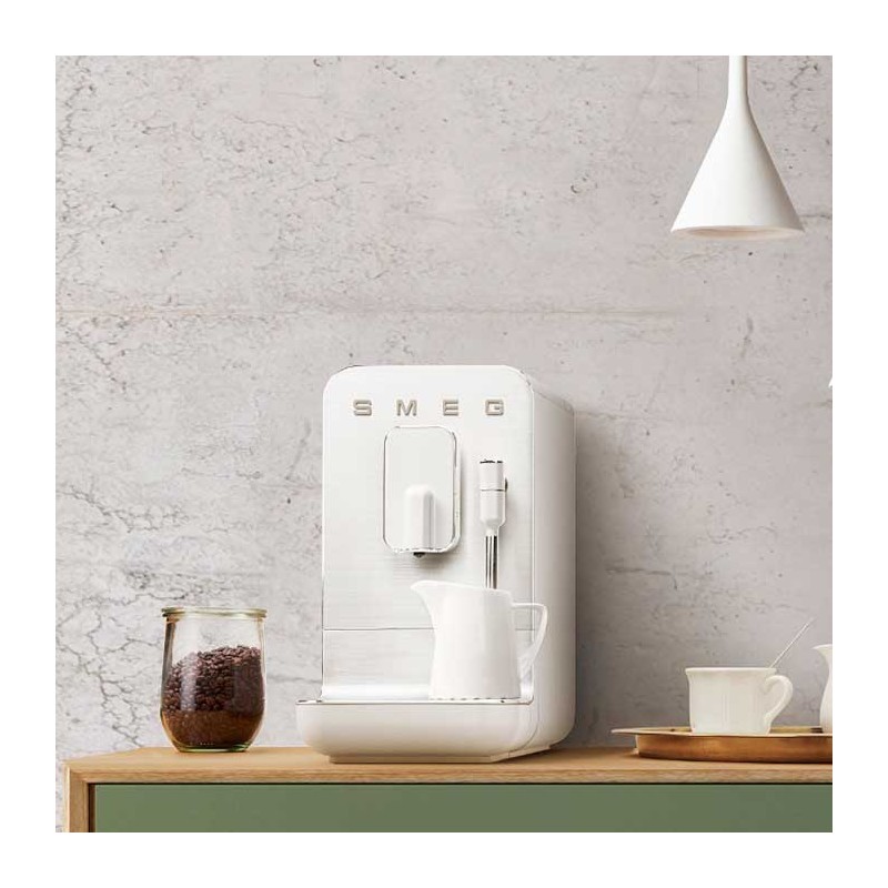 Máquina de café expresso superautomática com vaporizador Smeg 50's Style acabamento branco fosco com 19 bares de pressão e sistema de aquecimento Thermoblock.