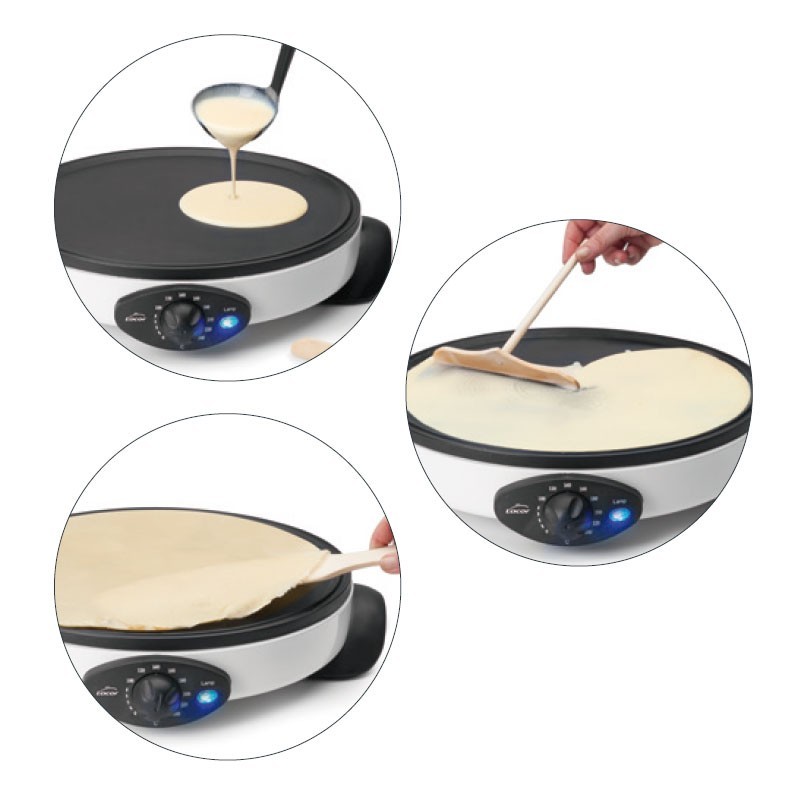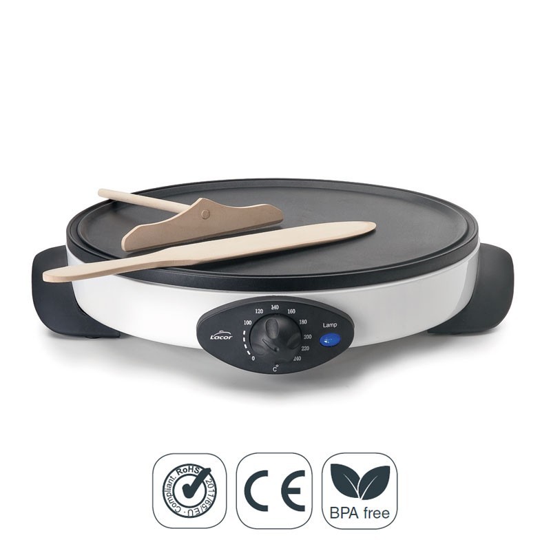 Crepera elétrica White de 1000 W com controlador de temperatura até 240ºC e a superfície antiaderente de 30 cm Inclui acessórios de madeira.