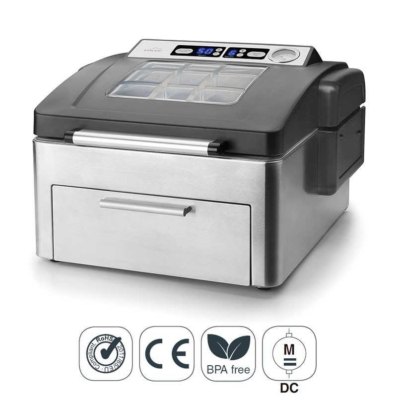 Máquina de embalagem a vácuo por meio de compressor de ar de 350 W . Ideal para uso em cozinhas profissionais de hotelaria e restauração.