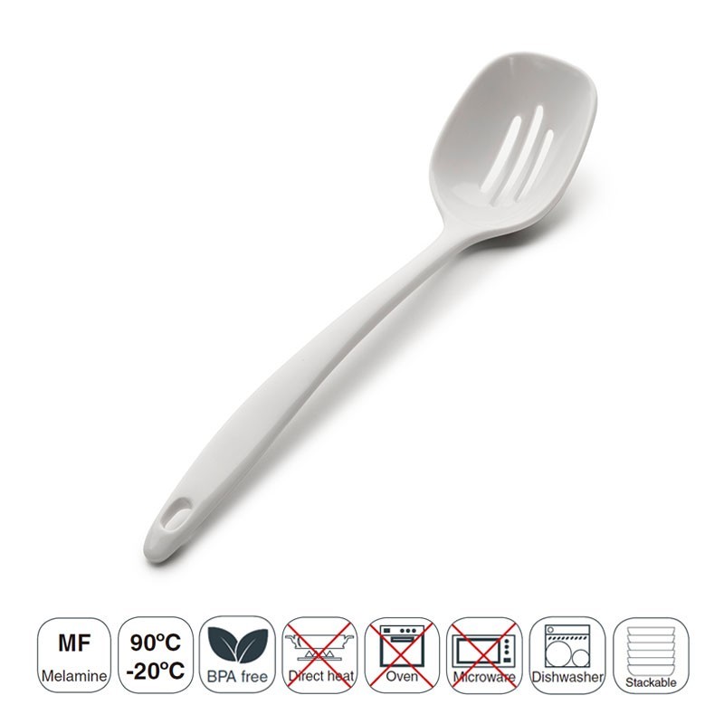 Colher perfurada de 30 cm de comprimento da gama Classic White produzida em resina sintética de alta resistência e apta para máquina de lavar louça.