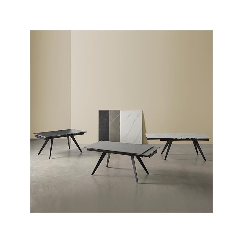 Com um tamanho de 160x90 cm que pode ser ampliado para 200-240 cm, esta mesa extensível de porcelanato é a solução perfeita para suas reuniões familiares ou com amigos. Sua superfície higiênica e de fácil limpeza a torna uma opção prática e durável para sua casa.