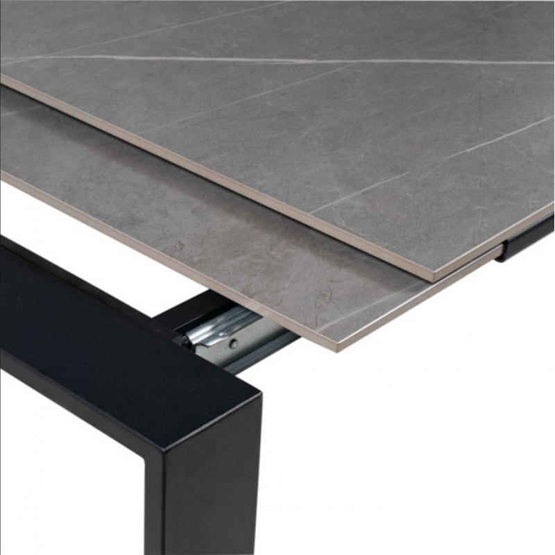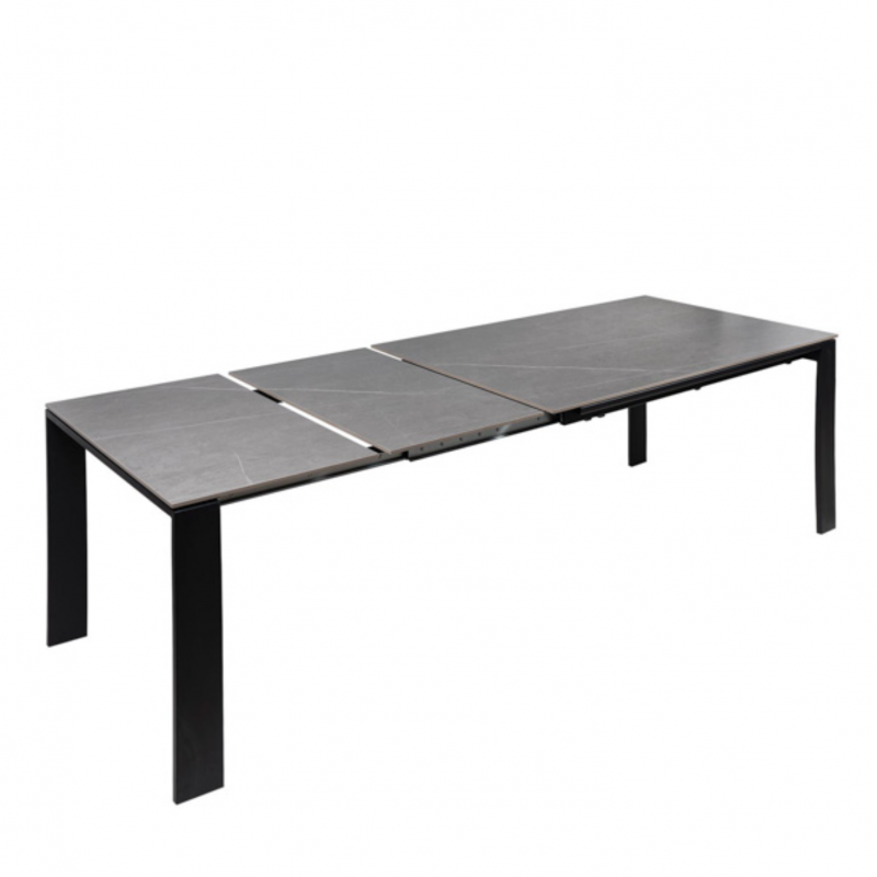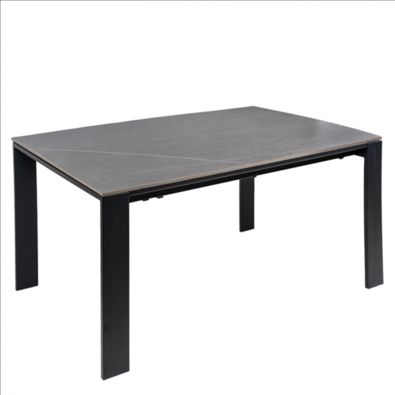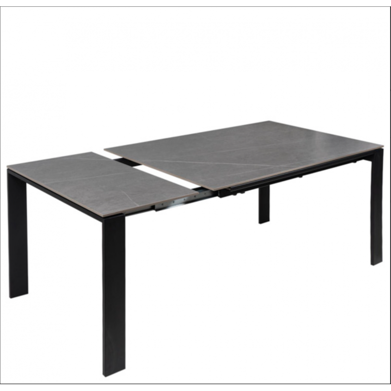 Descubra a elegância e funcionalidade da mesa extensível JANET 140 cinza/preto, um móvel de design moderno que se destaca pelo seu tampo de porcelanato maciço de 10mm em tom cinza e suas pernas de metal preto. Esta mesa extensível de porcelanato é a solução perfeita para espaços reduzidos que requerem versatilidade e estilo.
