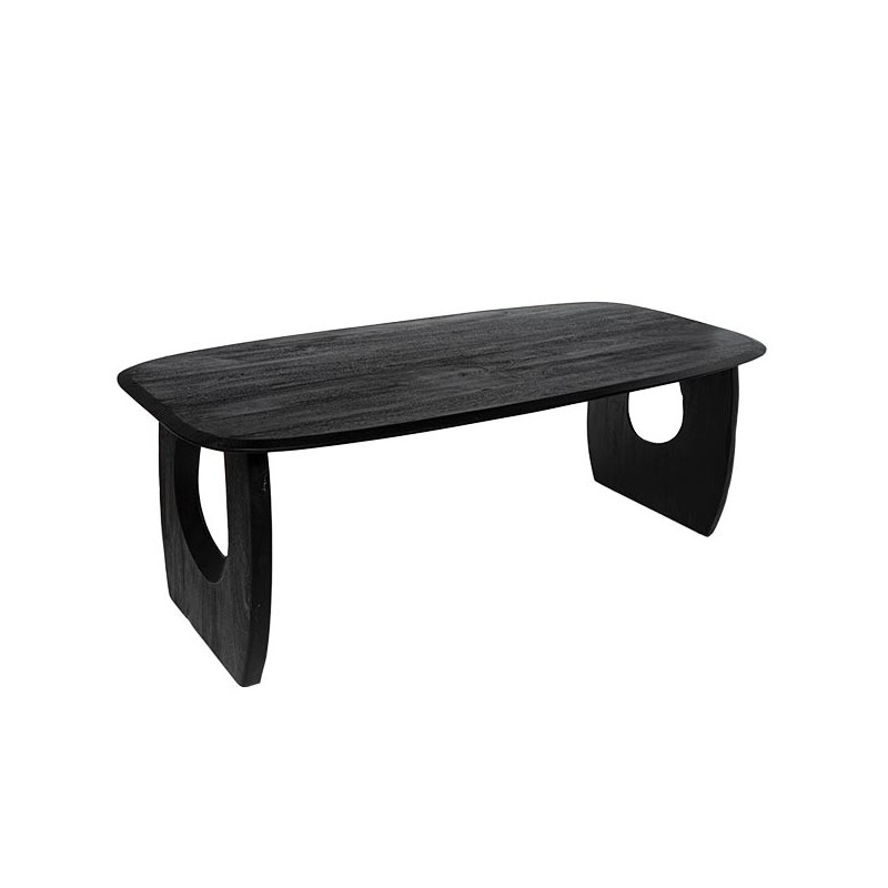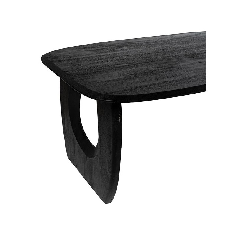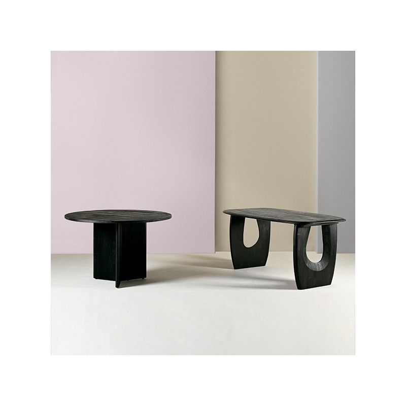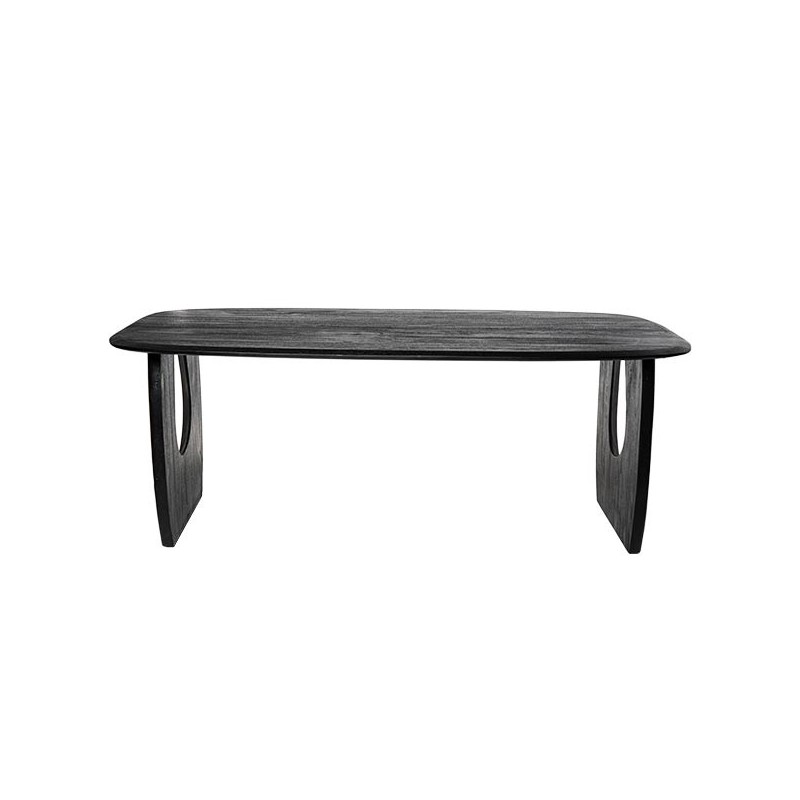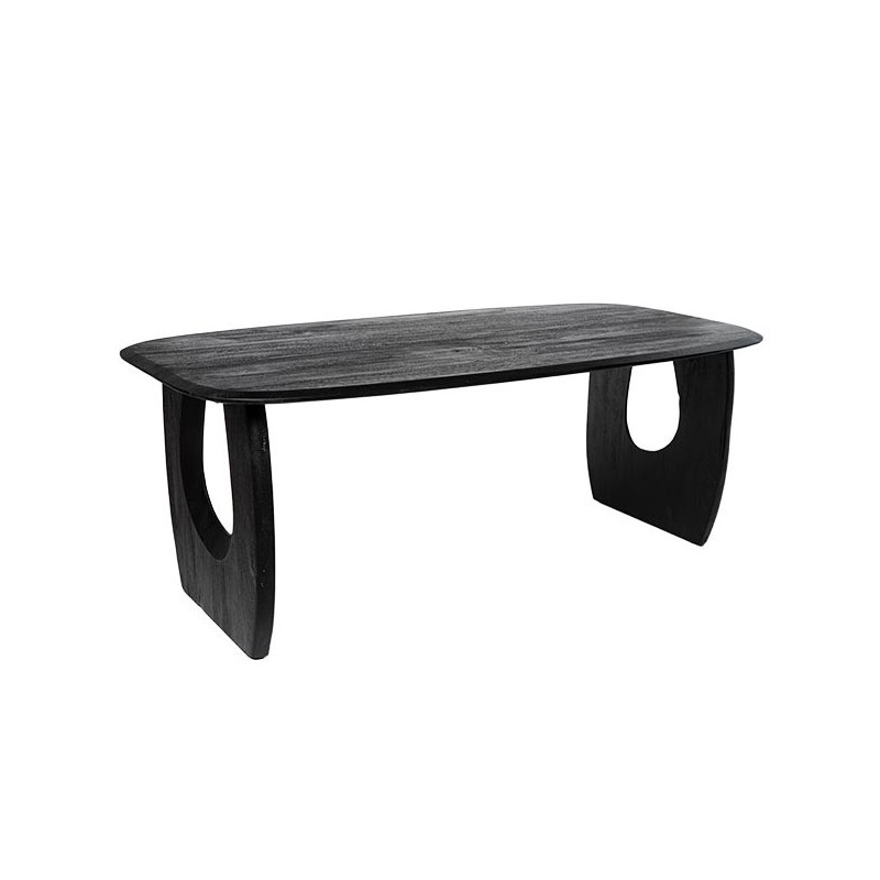 Descubra a mesa fixa WAZIR 160, uma peça original e sofisticada fabricada em madeira de acácia maciça com um elegante acabamento em cor preta. Seu tampo retangular com cantos arredondados destaca-se por sua textura marcada de veios de madeira, conferindo-lhe um aspecto natural e autêntico.