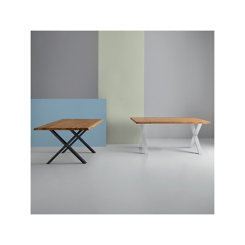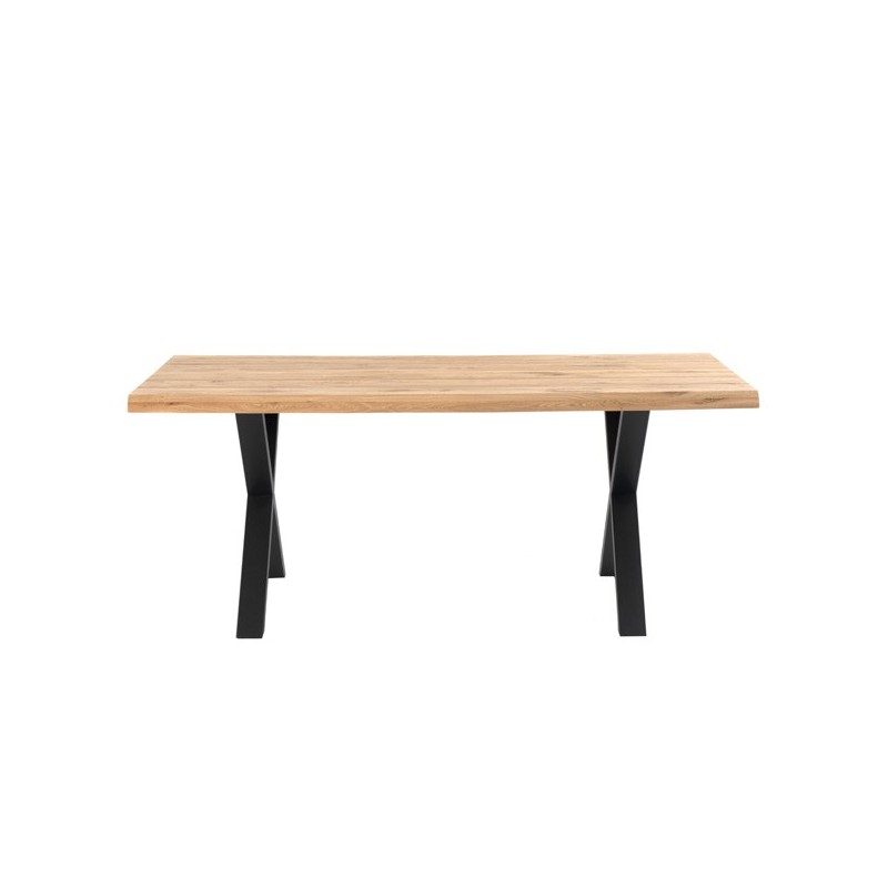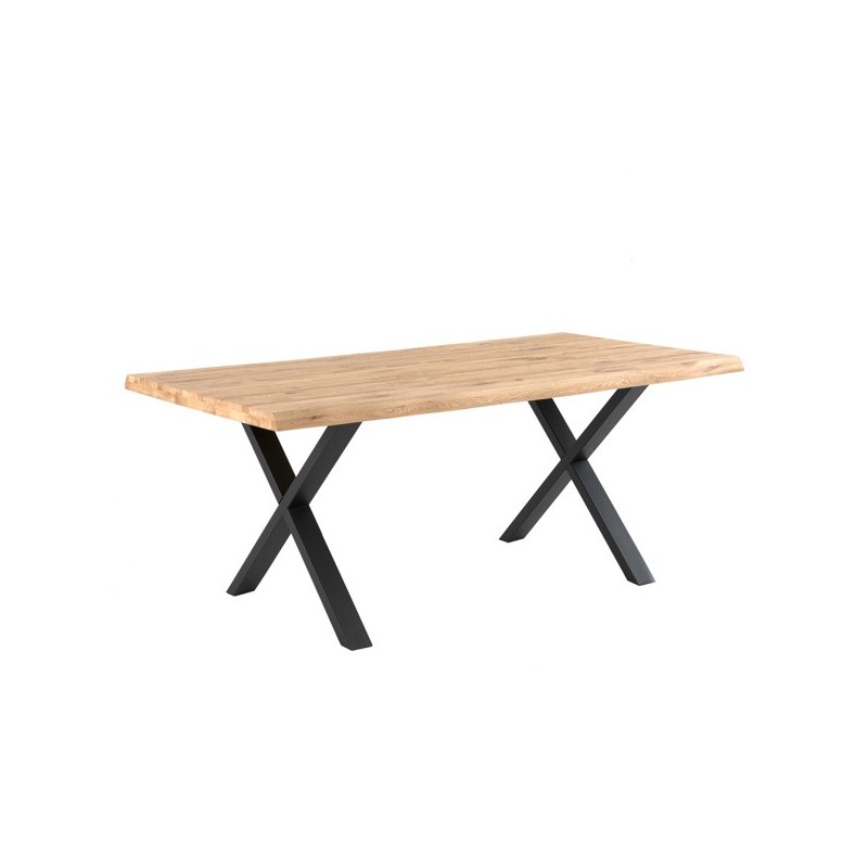 Mesa fixa CORINE de 140x90 cm, design moderno e elegante em carvalho maciço e pés de metal preto em forma de X. Ideal para ambientes industriais.