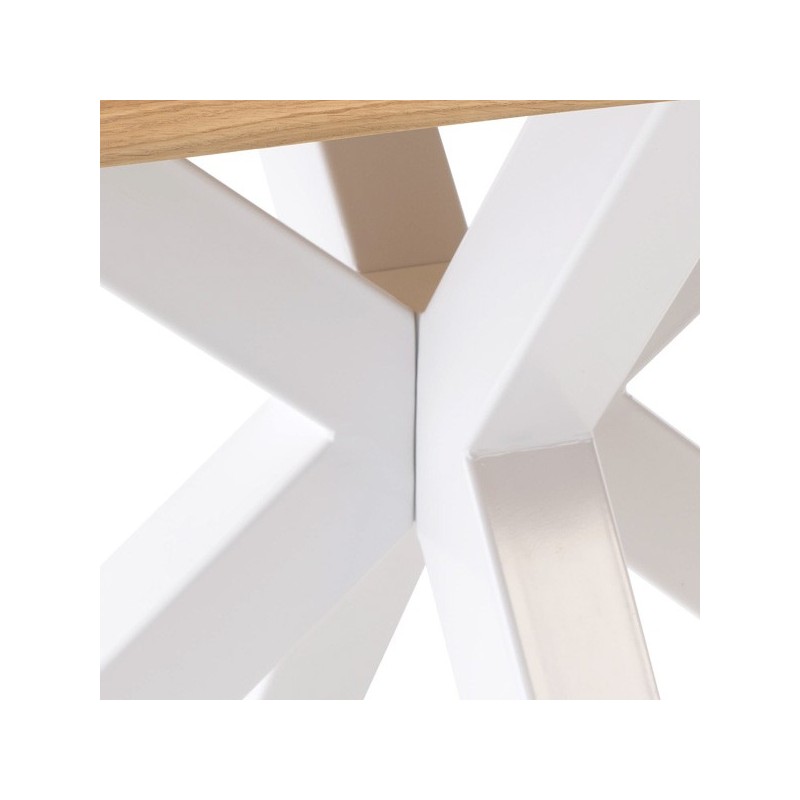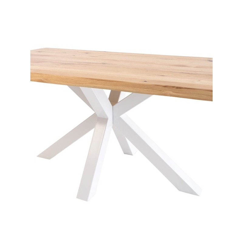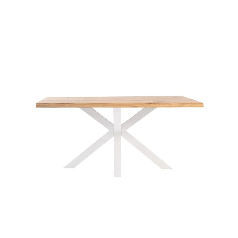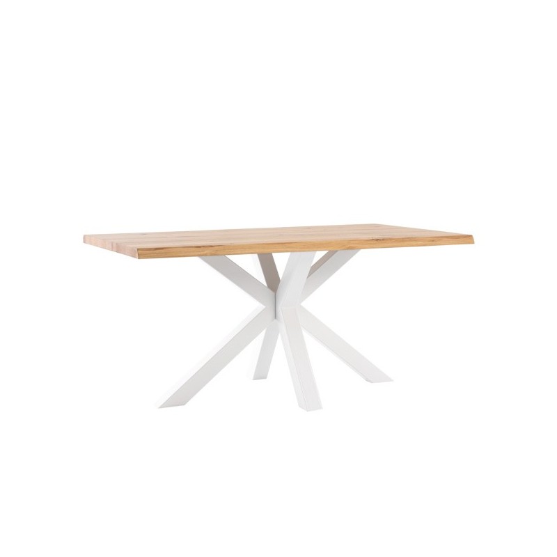 Mesa fixa GRACE 140 carvalho/branco, design robusto e elegante. Tampo de carvalho maciço, pernas de metal branco assimétricas. Ideal para estilo industrial.