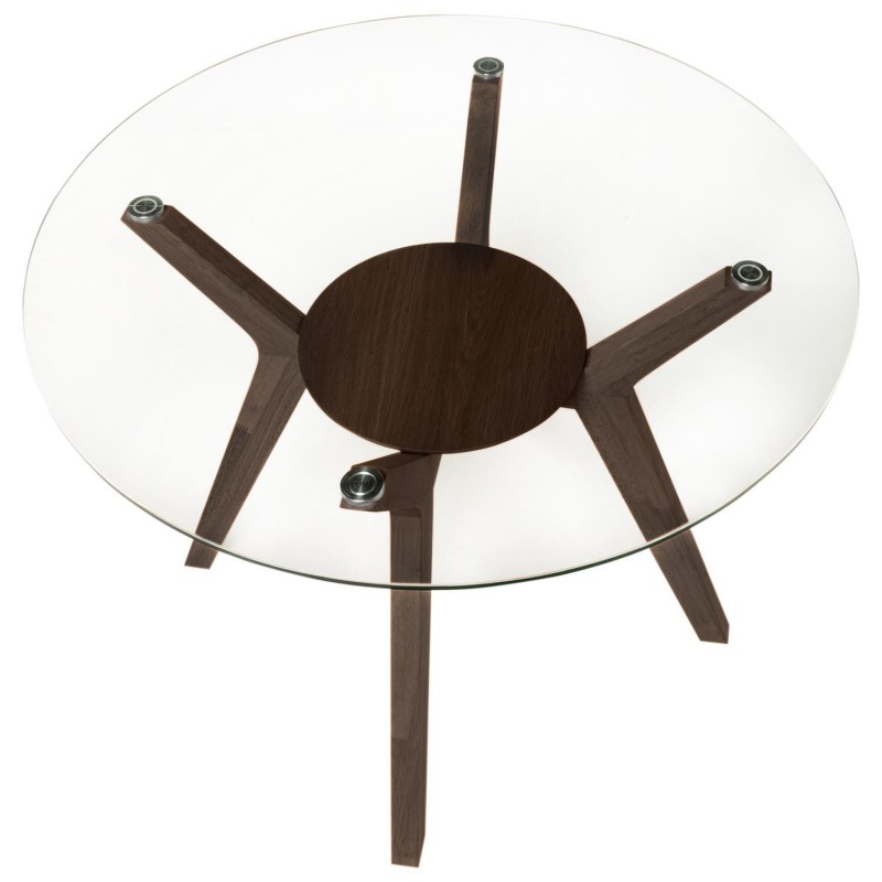 Mesa fixa SABRINE 100 vidro/nogueira, estilo contemporâneo e elegante. Tampo redondo de vidro temperado, pernas de madeira maciça em ângulo único.