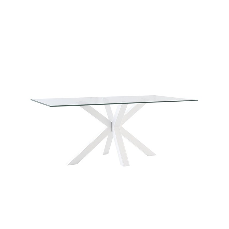 Mesa fixa DEMI 140 vidro/branco: elegante e resistente, ideal para espaços modernos. Medidas 140x90 cm, combina vidro e metal em design industrial.