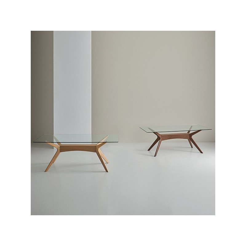 Descubra a mesa fixa DELLA 140 cristal/nogal, um móvel de design único que combina a elegância do vidro temperado de 1 cm de espessura com o calor das pernas de madeira de hevea acabadas em nogal. Esta mesa é perfeita para adicionar um toque de sofisticação à sua casa.
