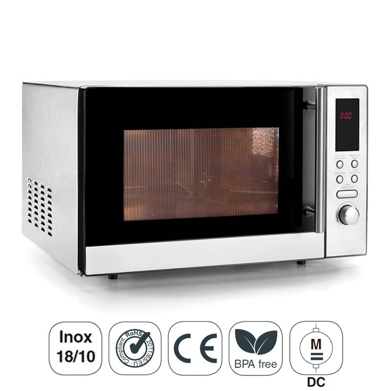Forno micro-ondas com prato giratório, função grill, display digital e 21 litros de capacidade fabricado em aço inoxidável 18/10 de alta qualidade e excelente resistência à corrosão.