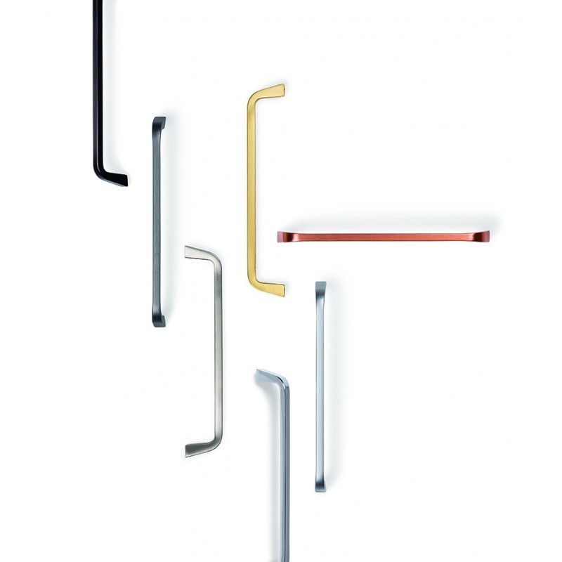 Puxador para portas da Viefe fabricado em zamac com acabamentos para criar combinações únicas: preto mate, ouro escovado, cromo brilho, cromo mate, cobre escovado, cinza grafite e níquel escovado.