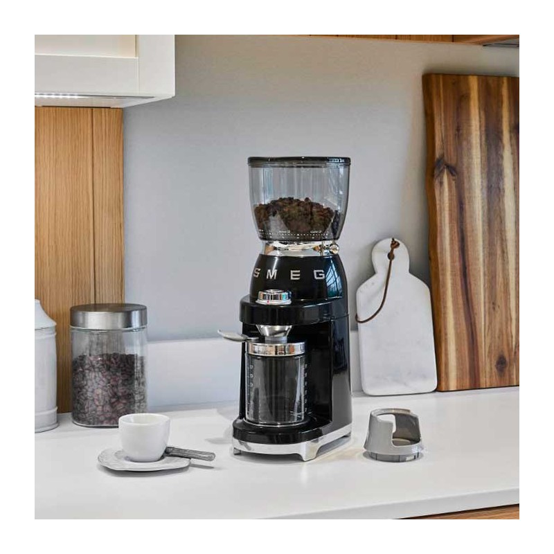 Smeg 50's estilo moedor de café elétrico com 30 diferentes níveis de moagem de grãos e corpo de aço inoxidável acabamento preto brilho.